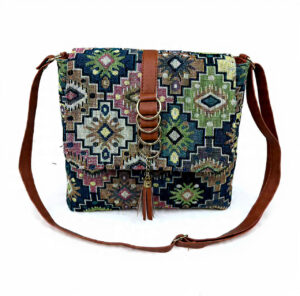 The Bohemian Tapestry Slate Bag features a vibrant woven fabric exterior with intricate geometric designs in blues, greens, and earth tones. It has a brown leather-trimmed flap closure with a snap button and a black triangular emblem that reads “SAQLAIN STYLE” in gold lettering. Ideal for casual outings, it offers a unique blend of ethnic charm and modern functionality.
